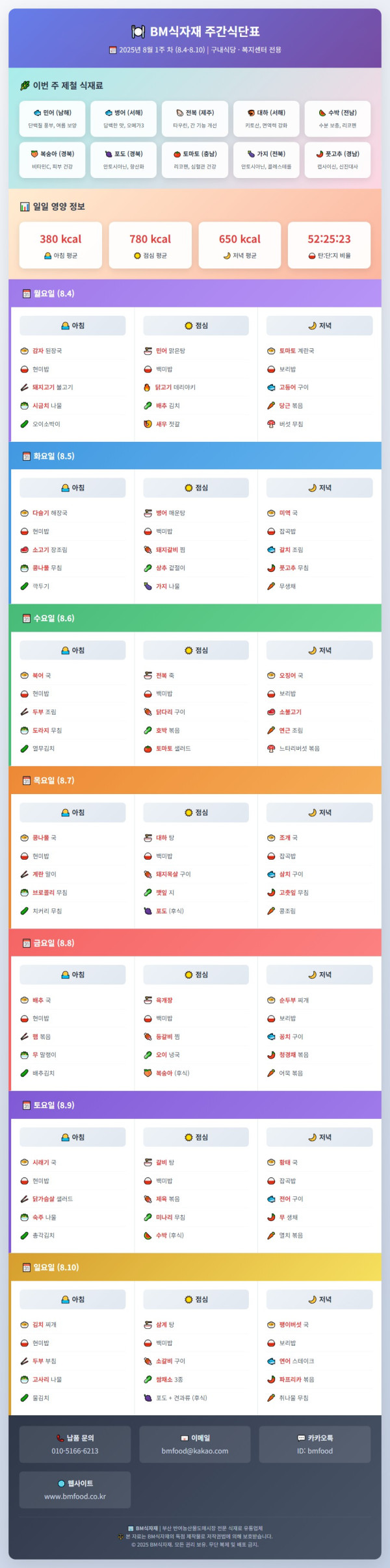 2025년 8월 1주 차 (8.4-8.10) 페이지 정보 작성자 (BM)운영자 댓글 0건 조회 1,129회 작성일 25-08-04 05:53 본문 2025년 8월 1주 차 (8.4-8.10) 목록 이전글BM식자재 주간식단표 2025.08.11-08.17 25.08.11 다음글주간식단표 (2025.07.28-08.03) 25.07.26 댓글목록 댓글목록 등록된 댓글이 없습니다.