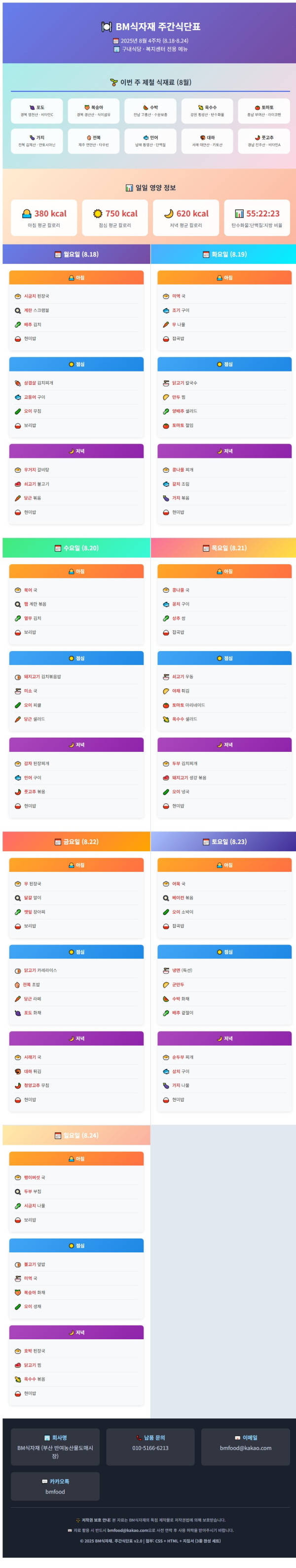 BM식자재 주간식단표 (2025년 8월 4주차) 페이지 정보 작성자 (BM)운영자 댓글 0건 조회 1,012회 작성일 25-08-19 06:01 본문 BM식자재 주간식단표 (2025년 8월 4주차) 목록 이전글BM주간식단표 2025년 8월 4주차 (8.25-8.31) 25.08.25 다음글BM식자재 주간식단표 2025.08.11-08.17 25.08.11 댓글목록 댓글목록 등록된 댓글이 없습니다.