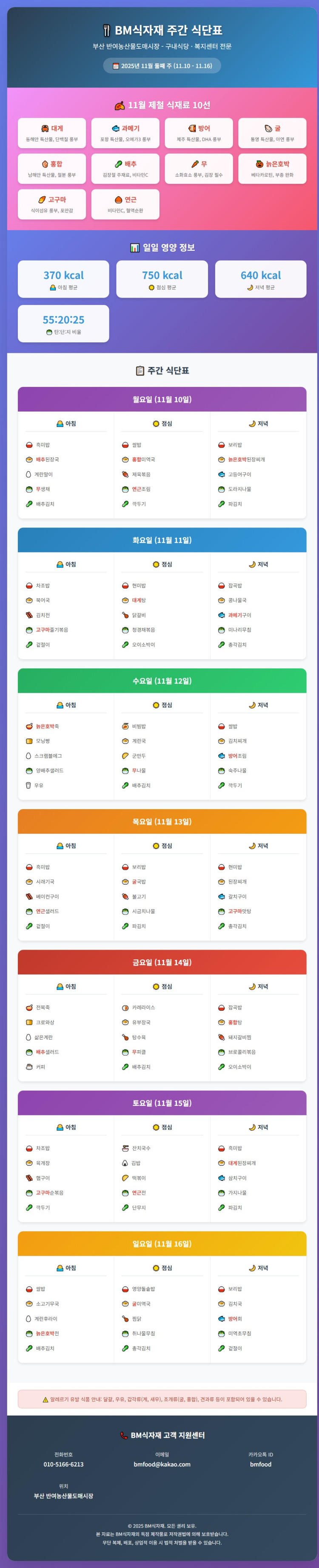 BM주간식단표(2025년 11월 10일~16일) 페이지 정보 (BM)운영자 작성일25-11-07 05:52 조회1회 댓글0건 다음글 목록 본문 BM주간식단표(2025년 11월 10일~16일) #비엠식자재 #비엠식재료 #부산식자재 #부산식재료 #반여농산물 #단체급식 #주간식단 #주간식단표#식당식자재 #유치원급식 #복지관급식 #식자재배송 #병원식자재 #병원식재료 #부산식재료도매 #신선야채 댓글목록 등록된 댓글이 없습니다. 다음글 목록