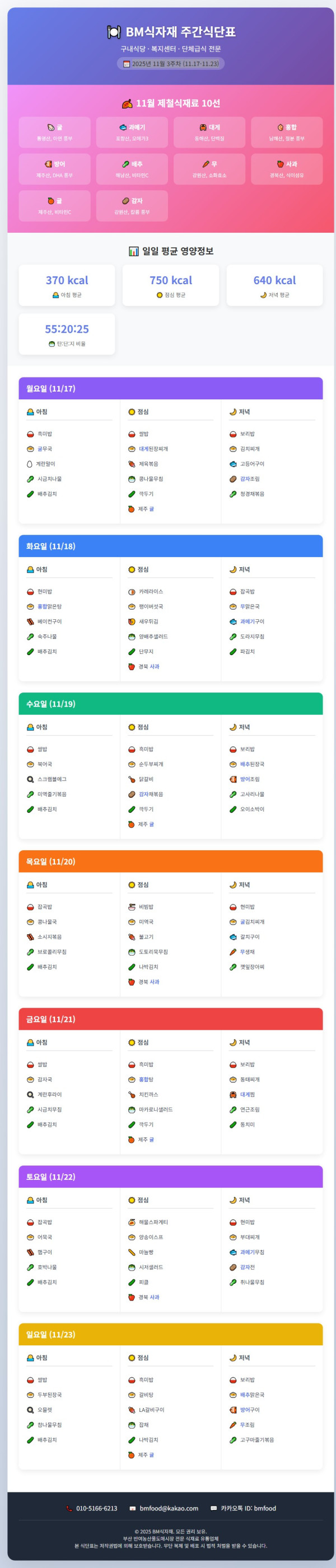 2025년 11월 3주차 (11.17-11.23) 페이지 정보 작성자 비엠식자재 댓글 0건 조회 6회 작성일 25-11-24 23:37 본문 2025년 11월 3주차 (11.17-11.23) 목록 다음글BM주간식단표(2025년 11월 10일~16일) 25.11.07 댓글목록 댓글목록 등록된 댓글이 없습니다.